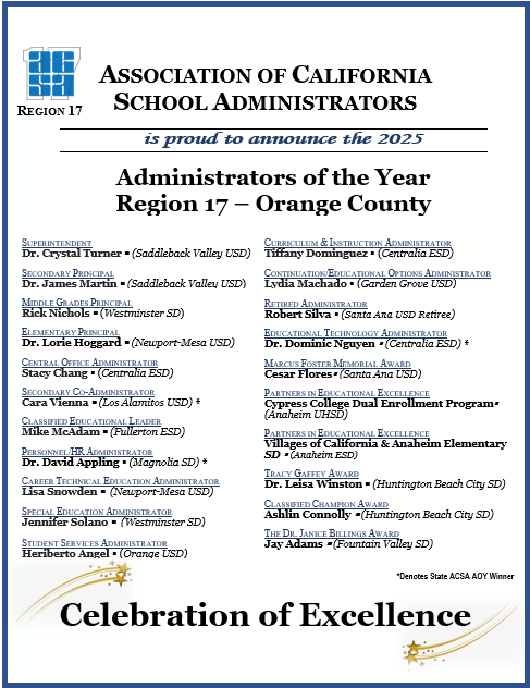One of ACSA's priorities is to ensure that school leaders are recognized for their excellence. Through our annual awards program, we honor students, administrators, and community organizations for their achievements and their dedication to public education at both the regional and state levels.